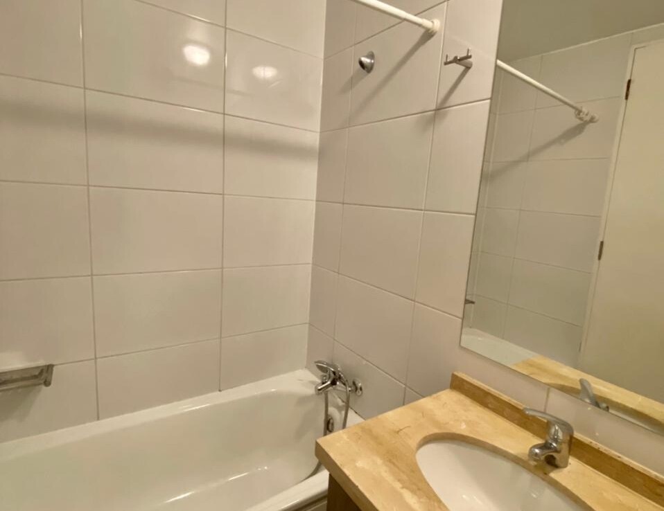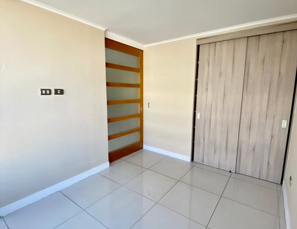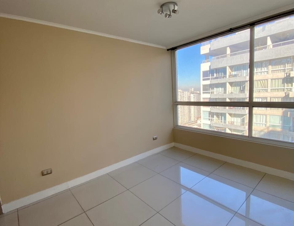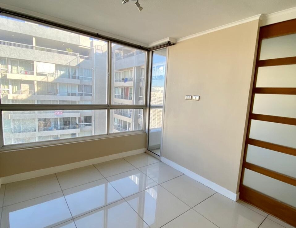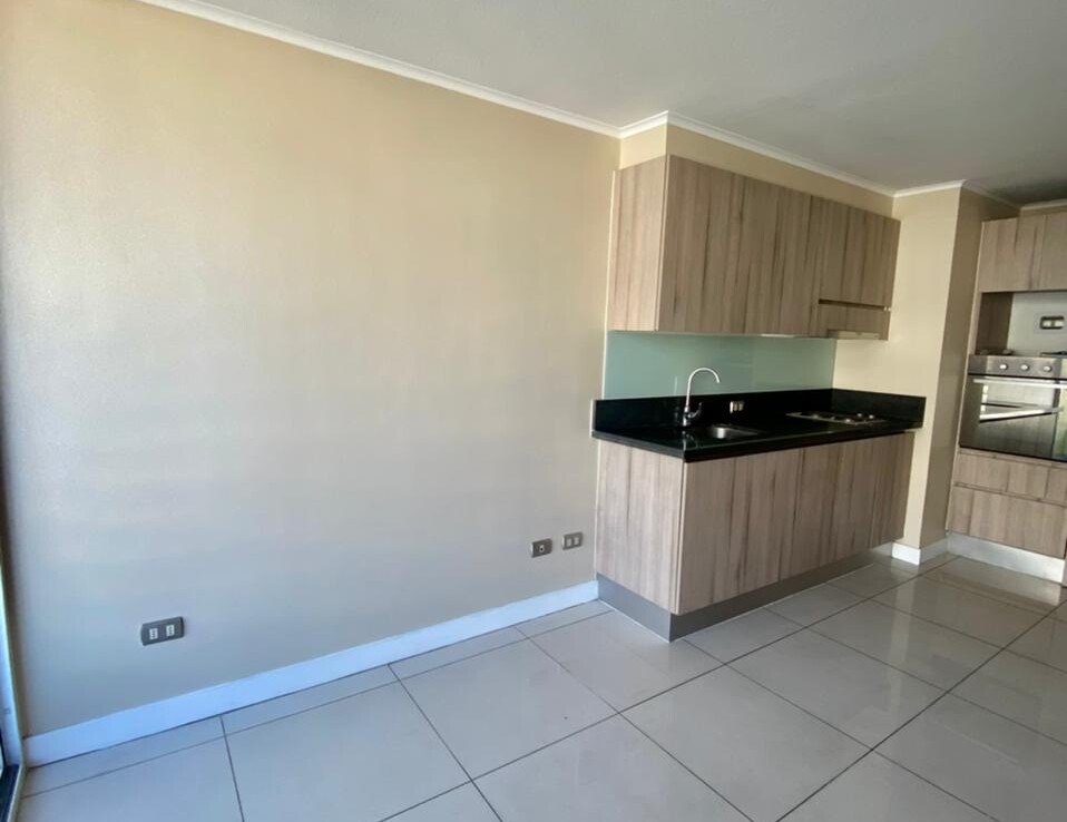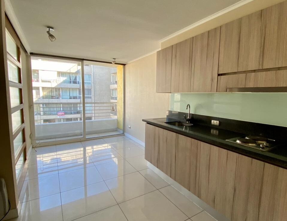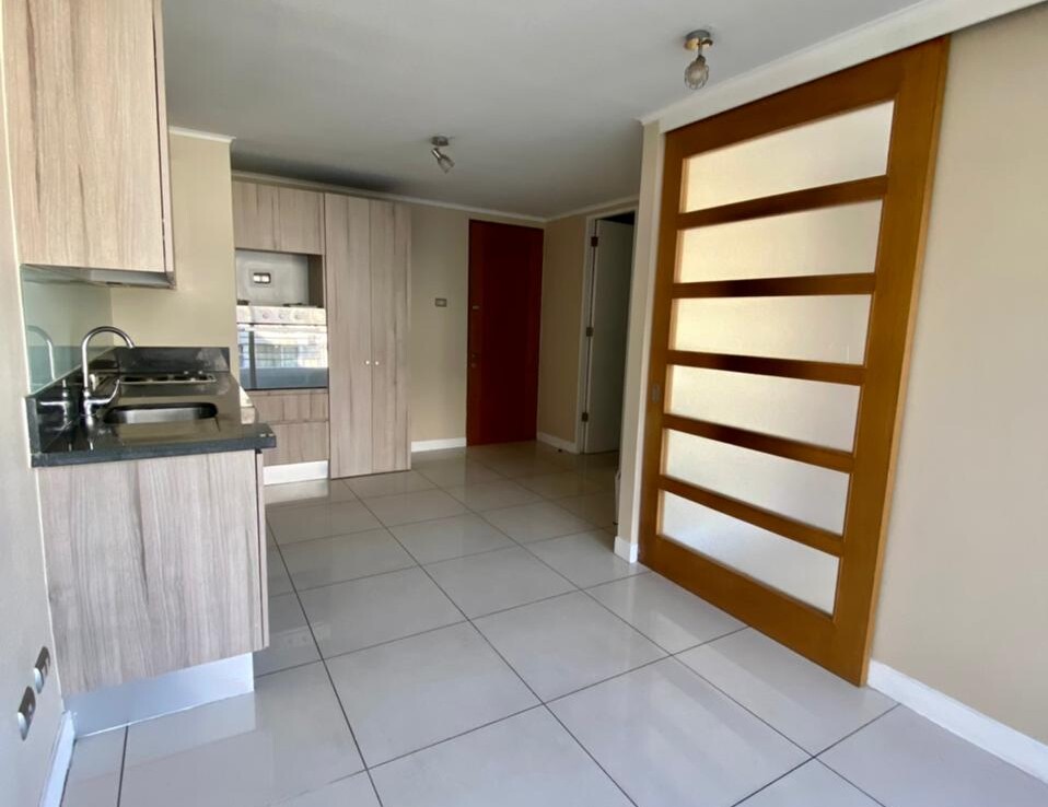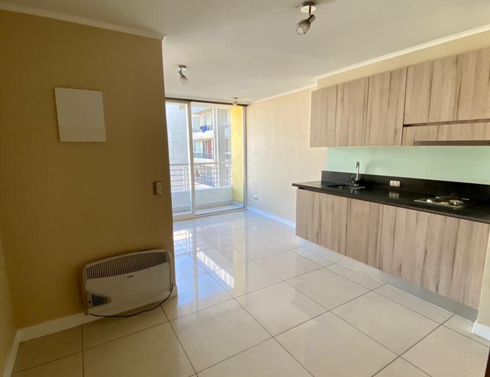 1 dormitorio con closet y salida a balcón, 1 baño completo, cocina integrada, abierta y equipada. El departamento tiene piso de porcelanato, ventanas termopanel, calefacción eléctrica individual, conexión para lavadora. No tiene estacionamiento ni bodega.